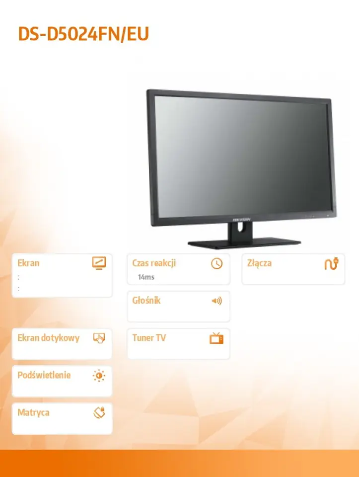 Hikvision 23.8" monitor, LED technology. Resolution 1920 x 1080, viewing angles: 178st. (H) / 178st. (V). Brightness: 250 cd/m3, contrast 1000:1, response time: 14ms. Connectors: 1xHDMI (input), 1xVGA (input). VESA mount. Adapted to work 7x24. Dimensions: 540x418x227mm, weight about 3.43 kg. Power supply 230V AC