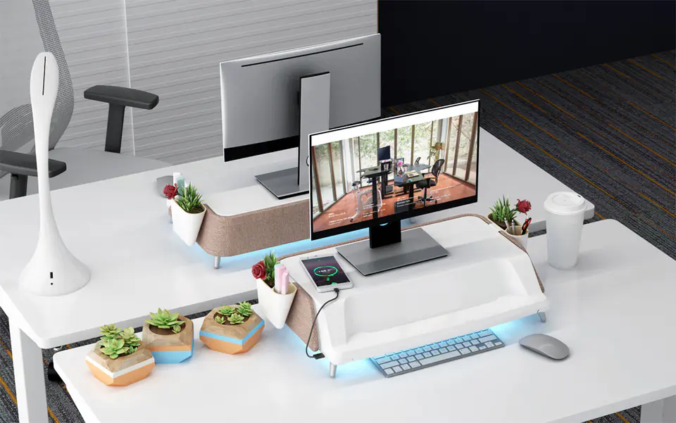Transform your traditional desk into an ergonomic workstation. This designer workstation elevates the monitor to a comfortable level of vision, eliminating unnecessary neck and eye strain. Get more comfort at your desk and keep things tidy - store your necessary office supplies in a drawer. With the USB port, you can charge your smartphone. UV light underneath ensures fast and effective inactivation of microorganisms. The built-in bactericidal and virucidal ultraviolet lamp allows you to disinfect m.in phone, pen and larger office devices, such as a keyboard or mouse. In addition, there is one USB-A socket on the side, with which you can, for example, charge a smartphone.