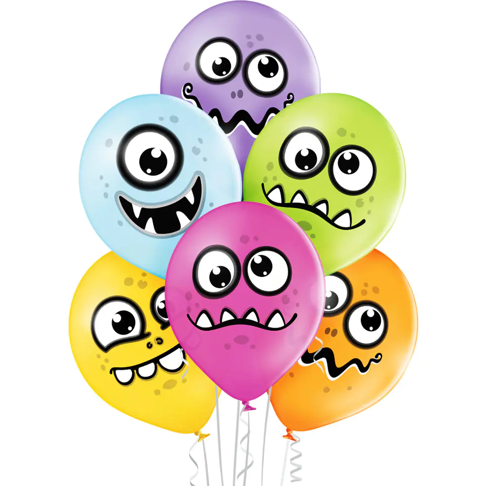 Printed balloons. Pattern: Monsters Size: +/- 30cm - diameter 12". Colors: green-apple, bright-yellow, orange, pink, lavender, blue. The packaging contains 6 pieces.