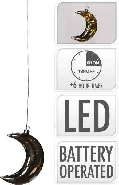 Moon Bauble Glass Hanging Decoration Christmas Decoration 10 LED Warm White Original Moon Shaped Hanging Ornament With LED Lights Made of Smoked Glass on Wire Will Add Charm to Any Room. It will look beautiful both on the wall, in the window and on the windowsill. The ornament has a timer that works in 6/18 mode. After six hours, the light will turn off and turn on again after 18 hours. Specification dimensions of the moon: 13 x 4.2 x 17 cm, cable length 50 cm, number of lamps in glass: 10 LEDs, glass color: smoky gray, powered by 2 AA batteries (not included in the set), light color warm white.