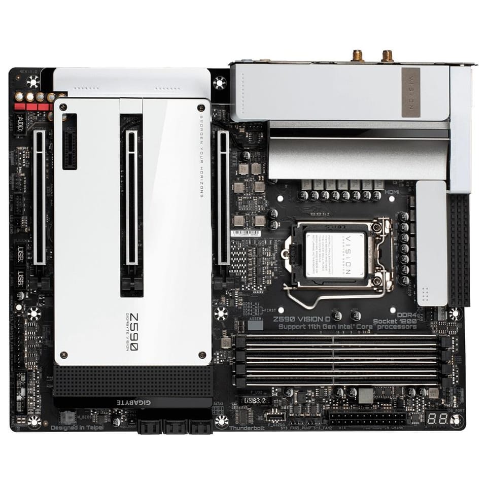 Intel Z590 Creators motherboard with unique VisionLINK TB I/O design, efficient thermal solution, Thunderbolt 4, Intel Wi-Fi 6 802.11ax and two Intel 2.5GbE LAN, two PCIe 4.0 x16 slots, triple NVMe PCIe X4 M. 2 connectors, front USB 3.2 Gen2x2 Type-C port