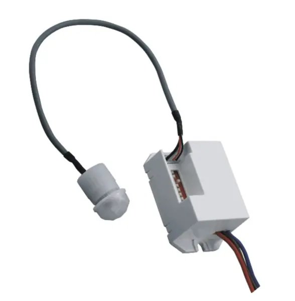 Motion sensor with external sensor, is used to automatically control lighting or other electrical devices. The lighting is switched on by means of a PIR motion sensor that acts on infrared. DIP-switches for adjusting: lighting time and light intensity sensitivity. The sensor works with LED lighting.