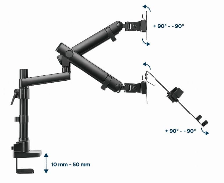 - The arms swivel, extend and retract, tilt to change reading angles, and allow displays to be rotated from landscape to portrait mode, etc.