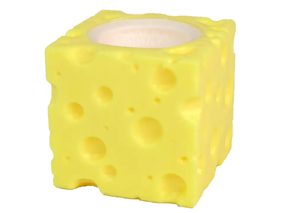 Just gently squeeze a cube of cheese with your hand, and the cheerful mouse will quickly jump out of the middle to hide in it again.