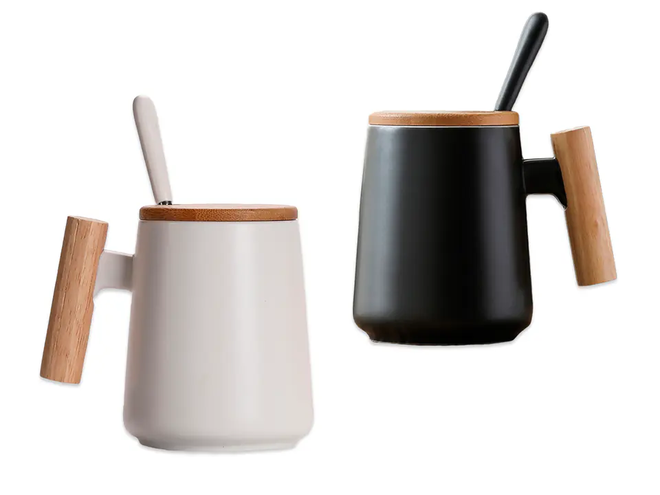 Mug with wooden lid, handle and spoon mix of 2 colors