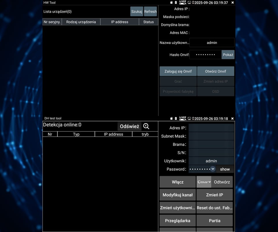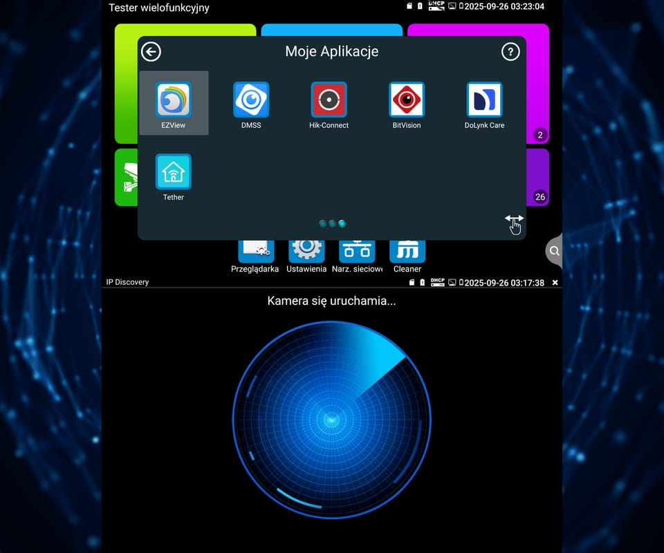 | Selected features: | AHD Camera Test HD-CVI Camera Test HD-TVI Camera Test PAL/NTSC Camera Test IP Camera Test - Supported Image Compression Methods: H.265, H.264, MJPEG Support Format: 5 Mpx, 16 : 9 HD-CVI, DAHUA Search and preview of IP cameras compatible with Onvif Virtual IPC Calculator Bitrate DH test tool Hik test tool UNV Test Tool HuaWei Tool Control of rotators and PTZ cameras (speed dome) Monitoring from IP cameras using built-in applications - iVMS-4500 HD, EZView, gDMSS HD Lite, XMEye, MEye, Fseye Built-in web browser - Google Chrome LAN Monitoring IP address scanner PING - testing the link using ICMP packets Detecting the connected port in the switch Twisted pair tester Cooperation with cameras and PoE switches PoE power meter Power source DC 12V / 48V Data monitor - RS-485 serial port monitor Hotspot Audio Test - Wi-Fi Video recording to a playable micro SD card (not in set) Playback of recordings Calculator Built-in flashlight |