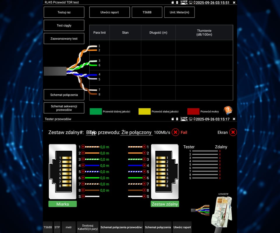 | Twisted pair or telephone line test: | Test of connection of UTP or telephone cables, terminated with RJ-45 plug |