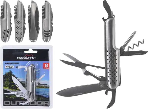 Multifunctional pocket knife with 8 functions In the pocket knife you will find , a pair of scissors, 2x bottle opener, file, screwdriver and can opener, corkscrew, knife. Pack your pocket knife and enjoy every beautiful, calm and relaxing step. Specifications: Dimensions:9 cm, Material:stainless steel, No choice of color. Goods sent randomly.
