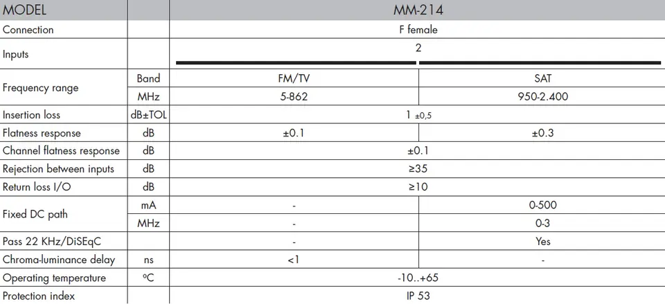 Inputs: FM/TV, SATFM/TV----------Stage range: 5~862 MHzMense: 1 dB ?0.5 Bandwidth separation: >= 35 dBDfit: >= 10 dBPower permeation: NonSAT----------SAT frequency range: 950~2400 MHzDupling: 1 dB ?0.5 Bandwidth separation: >= 35 dBDefit: >= 10 dBPower permeability: 0~500 mA----------Operating temperature: -10 ~ 65°CProtection class: IP53