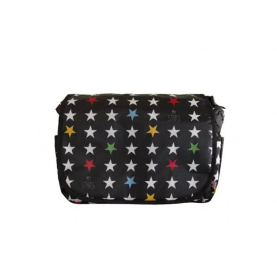 My Bag's Flap Bag My Star's black Beautiful, practical stroller bag with multiple pockets and compartments to comfortably hold all your baby's needs. The set includes a changing table that matches the pattern of the bag. Material: 100% laminated cotton Cleaning method: wash at 40st, do not spin, do not iron, do not dry clean Dimensions: 38 x 30 x 16 cm Weight: FLSTABL