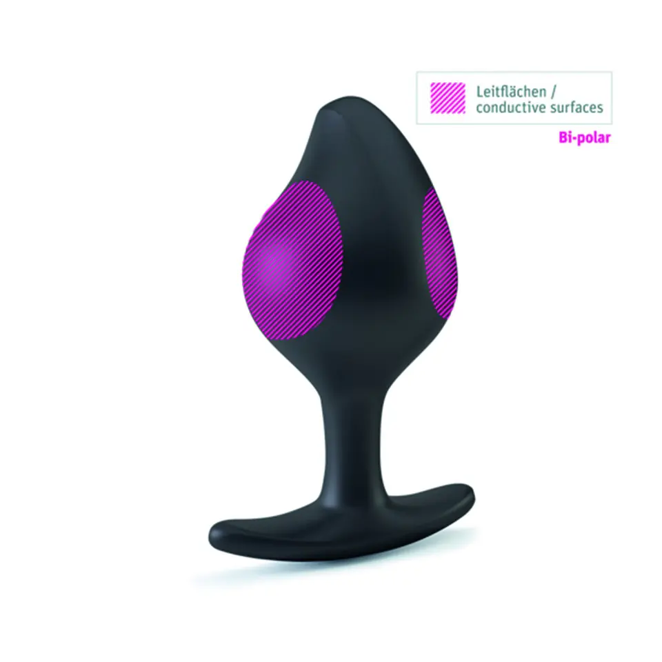 Our Rocking Force L is an ergonimically formed bi-polar e-stim butt plug with cable plugs on the side, allowing for comfortable wear even for longer periods. With its ergonomic shape, the Mystim Rocking Force is the comfiest horse in our stable. The cables come out on the side, allowing for comfortable wear even for longer periods. But let's take it from the top... uh... no... from behind... The butt plug is made of 100% medical-grade platinum silicone. With a vertical separation of the poles, the electrostimulation can be felt directly upon insertion, and the user will have a very happy bottom in no time... Length: 10,5 cm Diameter: 4,7 cm max Material: 100 % medical grade platinum Silicone Weight: 90 g With e-stim: yes Poles: 2 (bipolar) Junction: 2 mm plug (female)