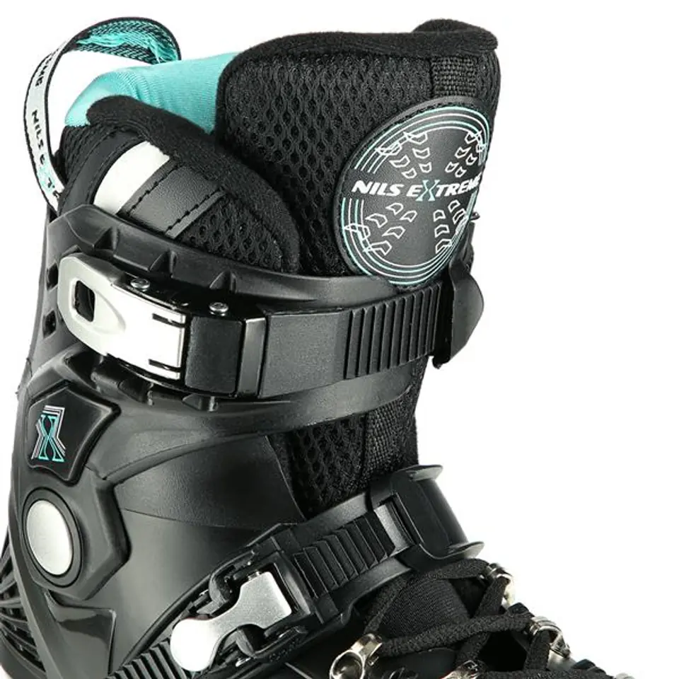 NA20001 Nils Extreme, is a skate designed for freeride skating. They are designed to provide the best possible maneuverability, precision of movements and stability when overcoming slaloms. Stable construction Their construction is based on a hard but light shoe and a special one-piece, reinforced aluminum skid. The skid was made using a special die casting technology. Wheels and bearings High quality traction, provide bearings of class ABEC9. Soft wheels guarantee good adhesion to the ground and absorb all vibrations well. Their specific configuration is a factor that increases the maneuverability of the roller. The two middle wheels are larger than the two extremes, which gives you more control over the track. Bindings Fastening, is a double aluminum buckle with a tensioning mechanism and lacing, thanks to which the shoe perfectly adapts to the user's foot. On the outside of the shoe, there is a special slider, which is a common element used in freeride driving. Specification: Skid: Aluminum, one-piece, die-cast Bearings: ABEC9 Shoe: hard Wheels: 2 x PU 72mm/85A, 2 x 76mm/85A (size 35-39) 2 x PU 76mm/85A, 2 x 80mm/85A (size 40-44) Insert: EVA Material Mesh high density foam Foot length (mm): 269 mm Fastening: 2 x Aluminum buckle with tensioning mechanism Lacing Notes: Not intended for commercial use In accordance with PN-EN 13843:2009 Warranty 24 months