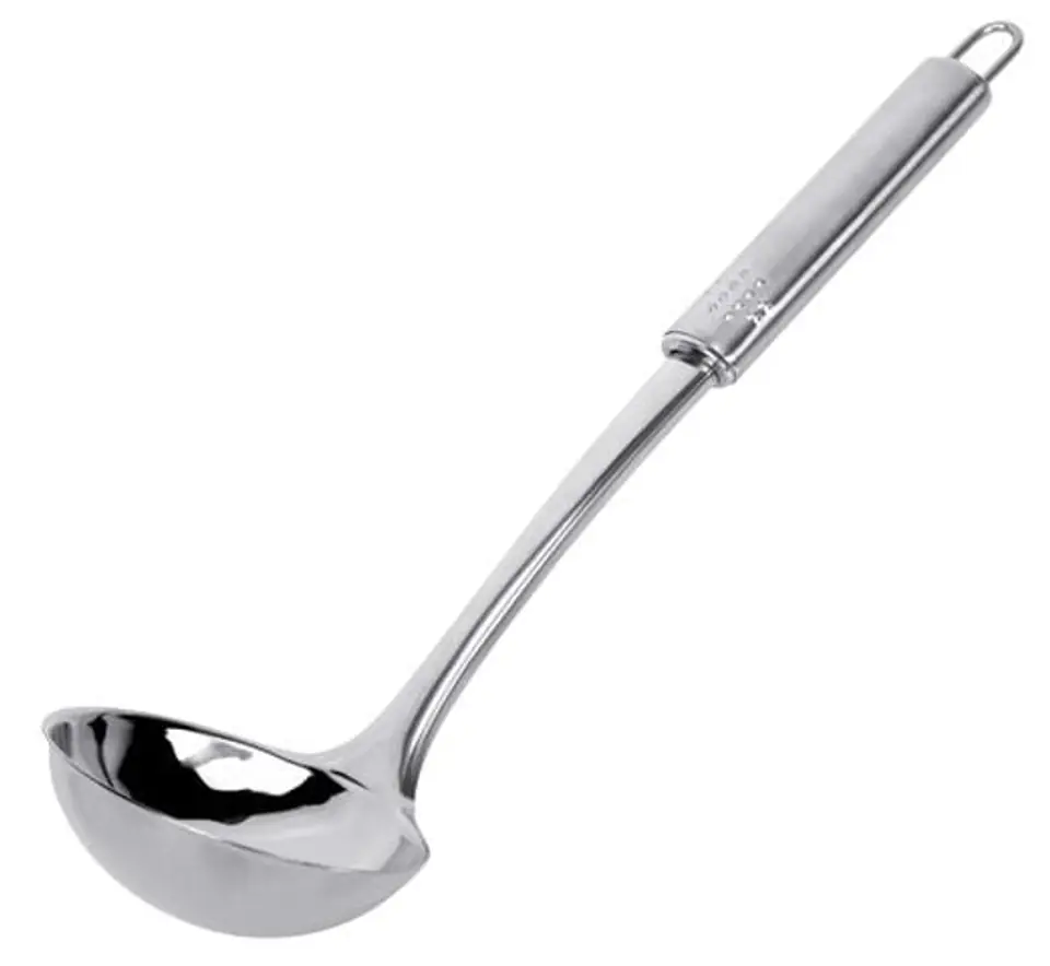 A universal and indispensable element in tableware - soup pickup. The product is made of high quality stainless steel. Thanks to its contoured shape, it is ideal for pouring or mixing soups and creams. The ladle has been equipped with a special handle with tabs, which allows a firm grip and prevents the product from slipping out of the hand. Additional information: -Product made of stainless steel. -Capacity: 100 ml -Length: 30.5 cm -Product handle equipped with a handle for hanging ladles Usage: -contact with food