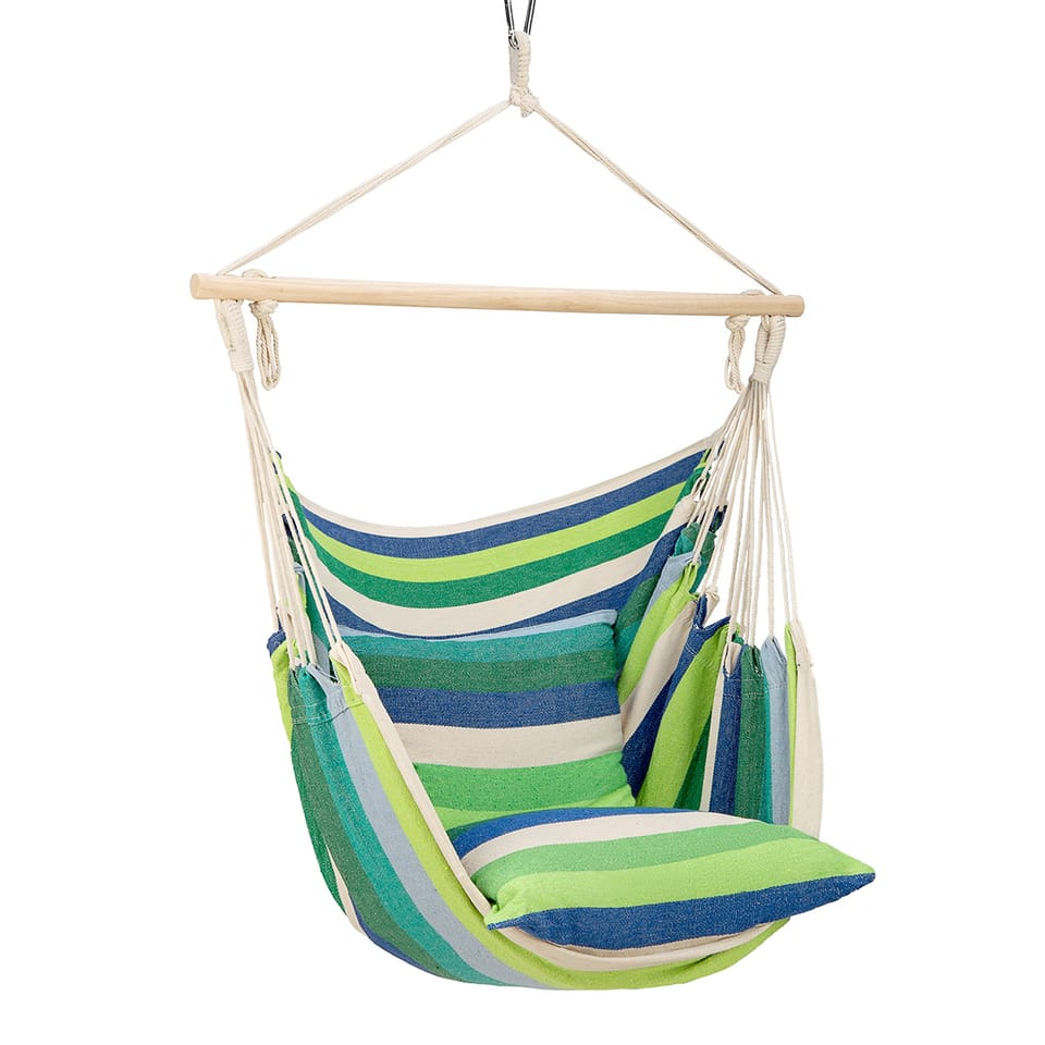 Relax in the fresh air. After these words, one before the eyes, physical activities related to it appear, such as walks or various types of sports. Others, on the other hand, imagine a place where they can sit comfortably and, for example, read a book. For the latter, the NILS CAMP brand has the perfect solution. We present the Brazilian chair model NC3107. These types of chairs slightly resemble a hammock, but they are much simpler to install. This is due to the fact that we hang them by one handle. This gives you the opportunity to mount at home, on the balcony, in the garden or even, take our favorite armchair to the campsite. They will also be an alternative when there is not enough space to hang a hammock. Reinforced steel handle will allow you to use the chair for a long time and safely. NC3107 is made of pleasant to the touch, breathable canvas, which is at the same time very durable and resistant to weather conditions and any abrasion. In combination, with thickly woven, strong ropes, a solid wooden frame and a metal handle, we get the maximum permissible load of 100 kg. In order to achieve the highest level of user comfort, two pillows are included. They are soft, pleasant to the touch and will certainly make it easier to settle in a comfortable position. The sum of all these factors gives not only durability and safety, but above all convenience and comfort of use. Assembly and disassembly, it is very simple, when folded, the chair does not take up much space. No problem, we will take them with us on a trip. Practicality is important, but let's not forget about design. Vivid, saturated, fashionable colors will make the chair not only comfortable but also pleasing the eye with its colors. Specification: Material: cotton Dimensions: Length: 103 cm Width: 99 cm Height: From seat to handle: 130 cm From seat to beam: 102 cm Dimensions when folded: Length: 12 cm Width: 90 cm Height: 12 cm Frame: Wooden straight beam Beam dimensions: 90 cm x diameter 34 mm Length of fastening ropes: 57 cm Metal handle: yes Maximum user weight: 100 kg Weight: 1800 g Notes: Not intended for commercial use 24 months warranty