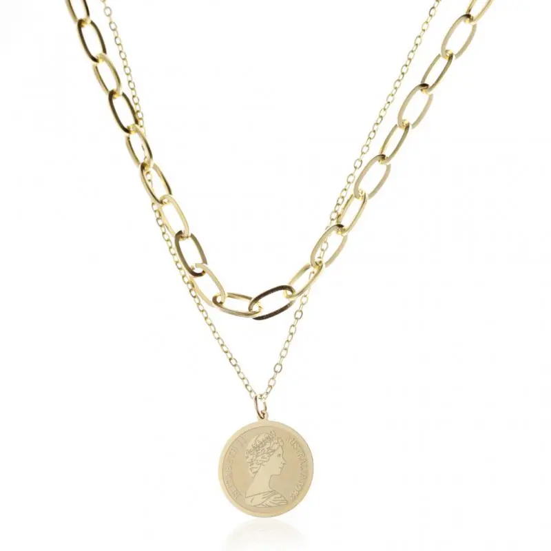 Fashionable surgical steel necklace New collection of stainless steel jewelry clad with 14 carat goldIt fits perfectly with elegant as well as everyday stylizations. An elegant accessory for every occasion, for dresses, sweaters and blouses. DIMENSIONSlength: 39 cm+ 5 cmornament 1.8 x 1.8 cmdoes not corrode, does not rust, does not darken!