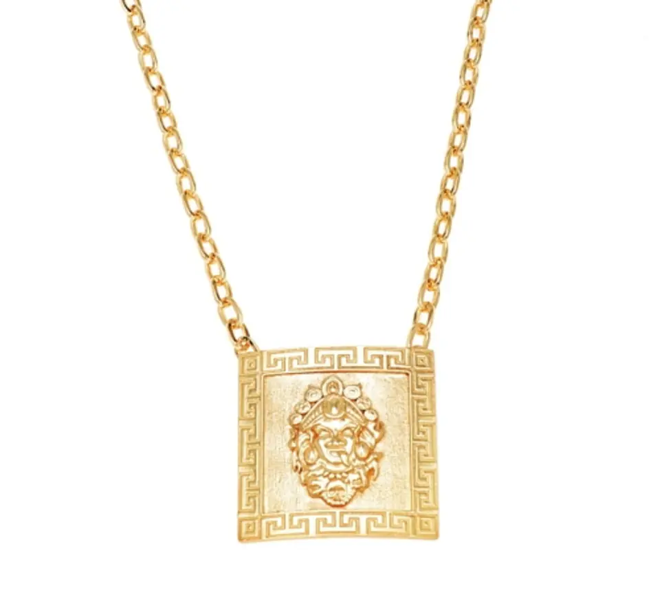 Gold-plated necklace with a square buckle with the motif of the Hindu goddess Kali. Necklace length 55cm, chain thickness 0.6cm. Pendant with dimensions of 5.1cm x 5.1cm. Gold-plated necklace.