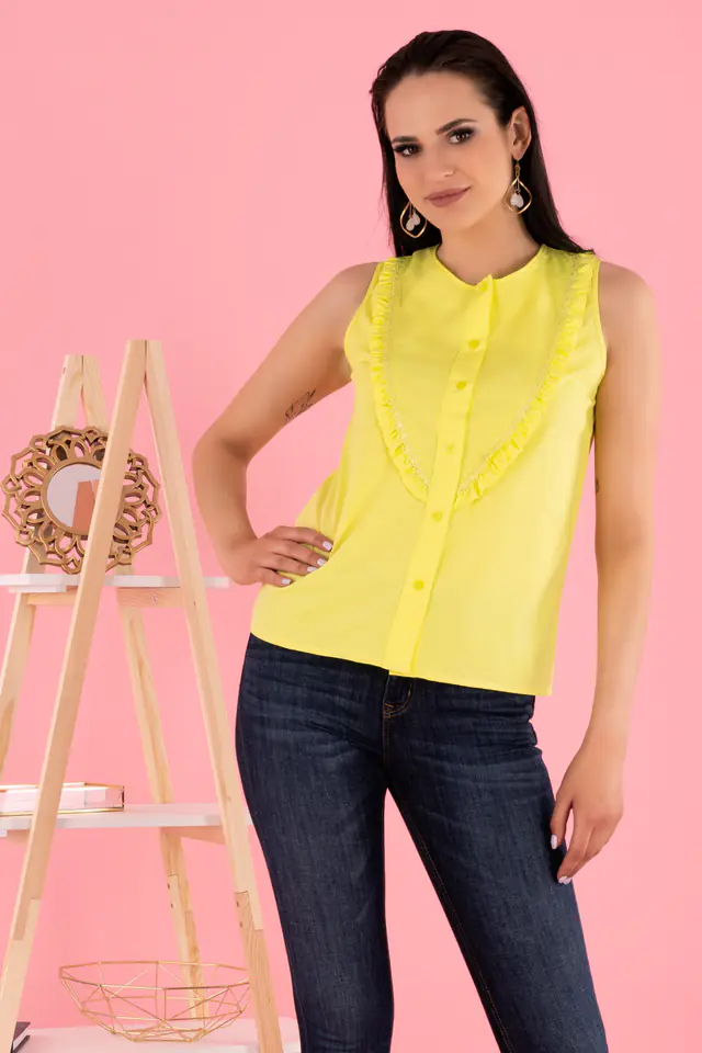 Letnia bluzka z przodu zapinana na guziczki. Pod szyją okrągłe wycięcie, z przodu ozdobna falbanka.