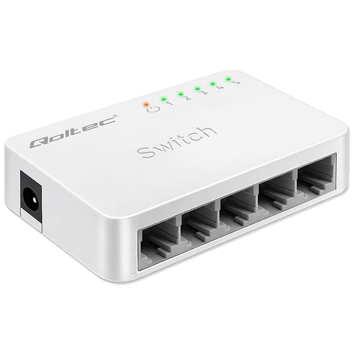 Discover the full potential of your networkIf you are looking for a reliable and efficient network device that provides you with a stable and fast connection and smooth data transmission, then our switch from Qoltec is the ideal choice. Thanks to its innovative technology and robust design, our device guarantees stable and smooth signal transmission from a single source to up to four devices simultaneously. This functionality allows for an exceptional expansion of the possibilities of use and exploitation of the multimedia system, without the need for additional complex solutions or costly investments in additional equipment. Now you can enjoy your favourite films, video games or presentations on several receivers simultaneously.Functionality always at handDiscover new possibilities with the Qoltec device that offers:- Signal distance up to 150m,- Equipped with 5 RJ45 ports, each port has an automatic line crossover function,- 100Mbps at 14880 packets per second, 1000Mbps at 14800 packets per second,- Enables efficient data exchange in full duplex mode compliant with IEEE802.3X, half duplex data flow control,- Supports up to 1024 MAC addresses,- The unit is also distinguished by 8-pin shielded ports to protect against electromagnetic interference, and an efficient heat dissipation system to ensure reliable operation even under intensive loads,- Has LEDs, which provide information on the current operation of the device.Expand your multimedia capabilitiesOur device offers instant and trouble-free installation, thanks to Plug & Play technology, which requires no additional configuration or technical expertise. You only need to follow a few simple steps. Firstly, connect the devices to the appropriate RJ45 ports using the appropriate network cables and then connect one of the ports to your router or access modem. Make sure the LEDs on the switch indicate activity on the ports.