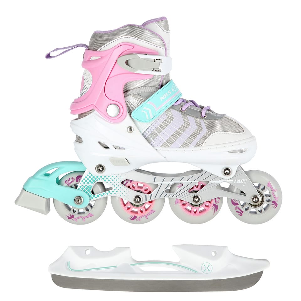 NH18192 Set Nils Extreme is a product designed for driving enthusiasts. It offers 4 configuration options. These are: skates, inline skates, roller skates and roller skates. Why choose NH18192 Nils Extreme? Because it allows you to take full advantage of the advantages of figure skating and inline skating. NH18192 Nils Extreme skates are characterized by very good running properties. This is due to the skids, made of high-quality stainless steel and the multi-lever fastening system, consisting of a velcro strap, buckle and laces, securely holding the feet. All this makes this model work well in all conditions, providing a unique driving experience. These are comfortable figure skates, designed for beginners and intermediate users. Their high quality guarantees durability and resistance to mechanical damage. NH18192 inline skates are pure joy of riding. Thanks to the possibility of transferring an additional wheel to the rear axle, the skate functionally changes into a roller skate. This solution will help the youngest skaters to take their first steps in this sport. In turn, the installation of an additional wheel on the front axle turns the product into a roller skate. The skate is equipped with a special aluminum skid and brake, which ensures safety while riding. In turn, ABEC7 class wheels and bearings allow for lower rolling resistance, i.e. faster driving. The NH18192 Nils Extreme model also has the possibility of 4-stage shoe size adjustment, allowing it to be adapted to the user's needs. It is a way to save time and money. This solution allows you to extend their life, it also gives you the opportunity to use them more than one person. Specification: Shoe: semi-soft Insole: EVA material, high density foam Inner length of shoe (mm): 215-240 Fastening: two-section buckle, velcro strap, lacing Skate skid: high quality stainless steel Skate skid: Aluminum Wheels: PU 64mm/82A (S) PU 70mm/82A (M) Bearings: ABEC 7 Size adjustment button Notes: Not intended for commercial use Complies with PN-EN 13843:2009 Warranty 24 months