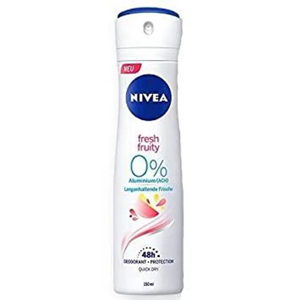 NIVEA Deo Fresh Fruity provides a natural feeling of freshness and reliable protection for the deodorant throughout the day. The can (without spray head) is 100% recyclable. Aluminium Free Deodorant (ACH) combines protection with gentle care. The fruity-scented cooling formula effectively protects against body odor for 48 hours and keeps it pleasantly fresh.