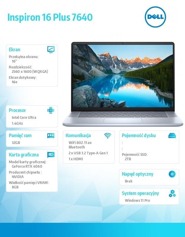 Notebook Inspiron Plus 7640 Win11Pro Ultra 7 155H/32GB/2TB SSD/16.0 2,5K 2560x1600/RTX 4060/FgrPr/FHD Cam/Mic /Backlit Kb/90 Wh/3Y Basic