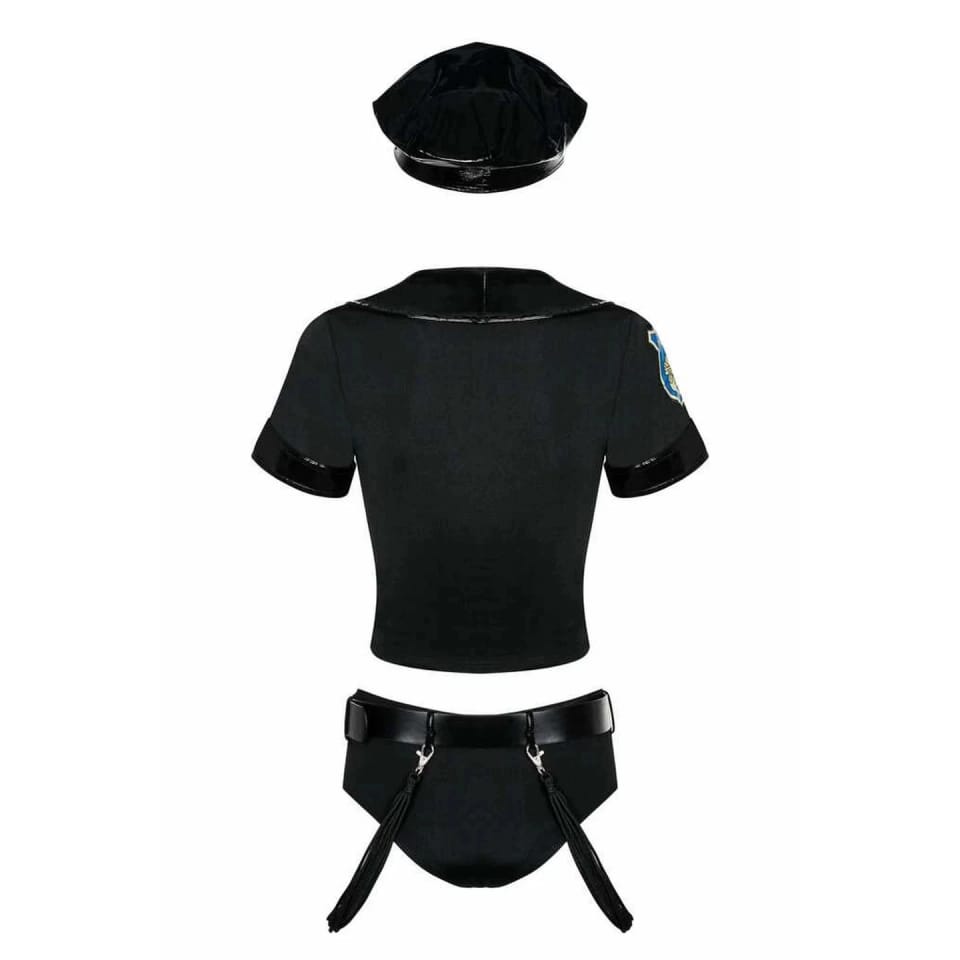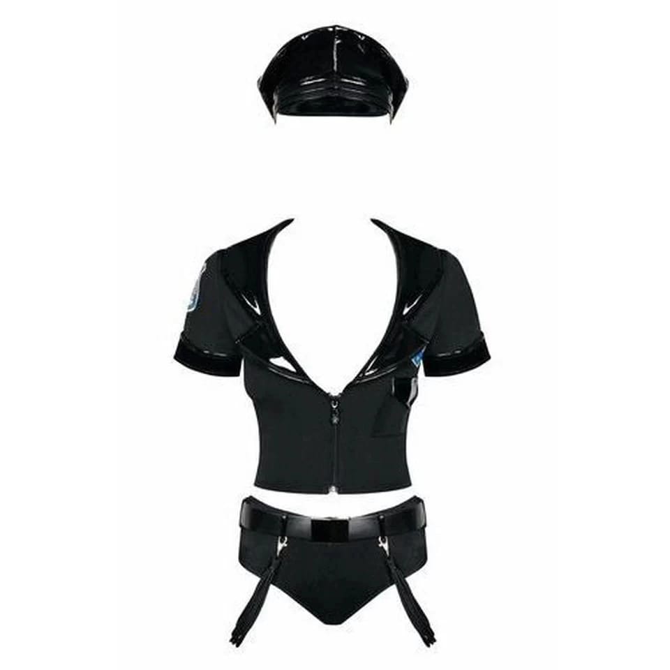 A 6 pcs policewoman set. A zip fastened top has collar, cuffs and a pocket made of vinyl. There are badges on right arm and over left breast. Particular shorts' cut emphasizes woman's body. Two detachable bundles of cordes are attached to the belt. A vinyl cup included. Size: S/M