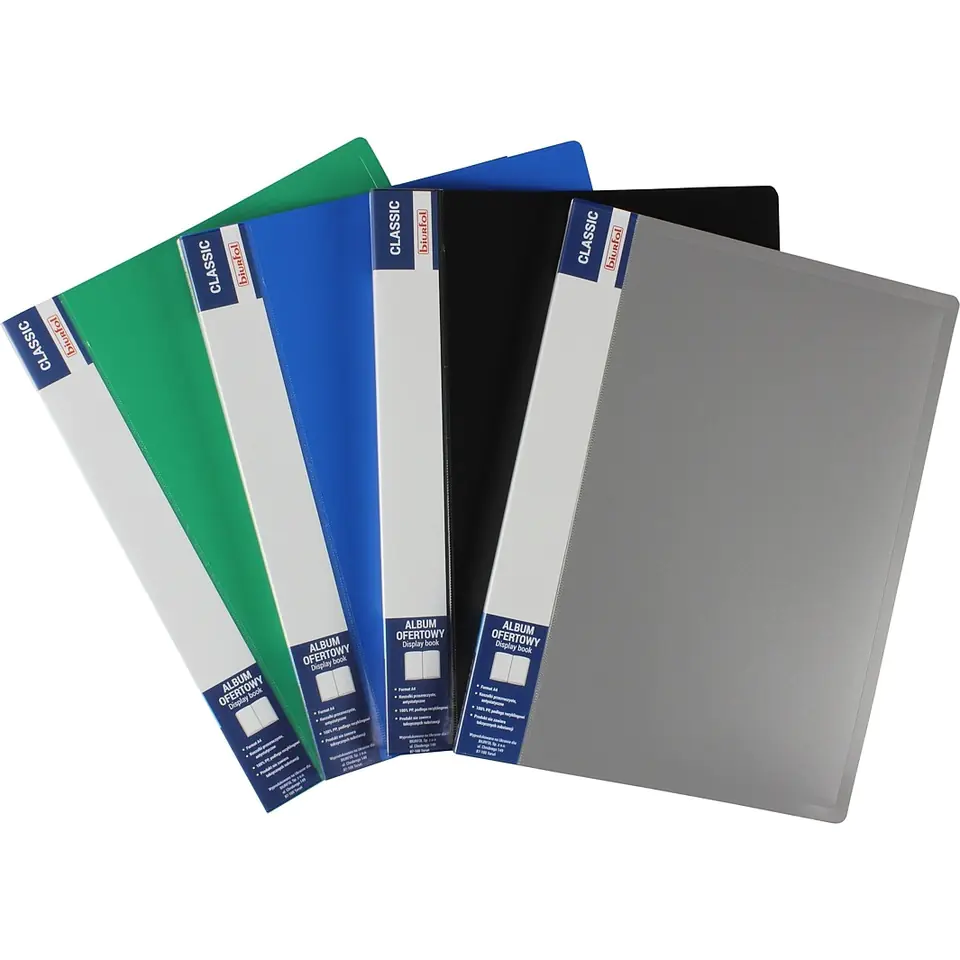 Made of colorful, smooth PP film from the Classic series; on the spine a practical wide label intended for the description of the contents; antistatic, transparent T-shirts; allows for effective presentation of the offer and segregation of documents;