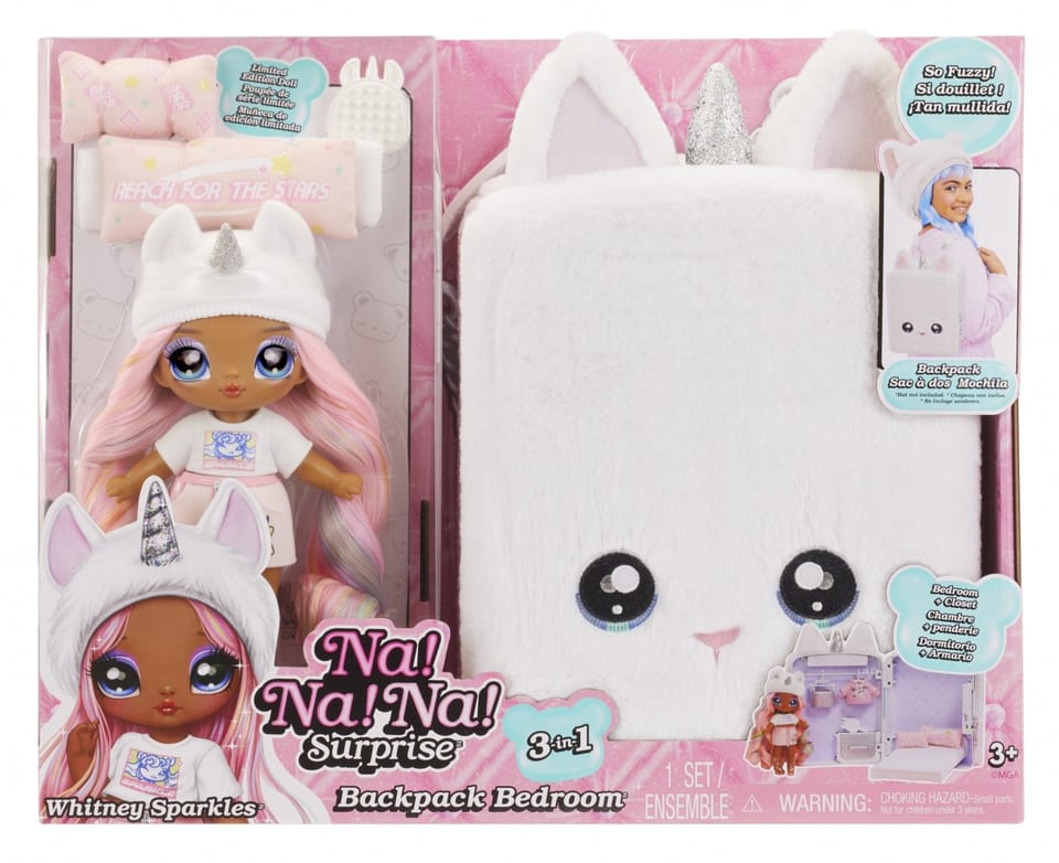 Unbox the most fashionable playset for your dolls with the Na Na Na Surprise Backpack Bedroom. This adorable, soft playset is 3-in-1 a stylish, pink unicorn backpack, adorable bedroom playset with closet and soft articulated fashion doll, Whitney Sparkles.
