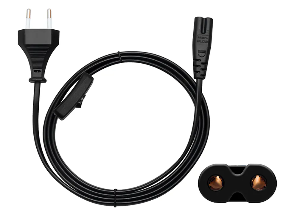 Mains connection with a flat electrical plug type SN-14 terminated with a simple plug of the "snowman" type (eight) and a switch.