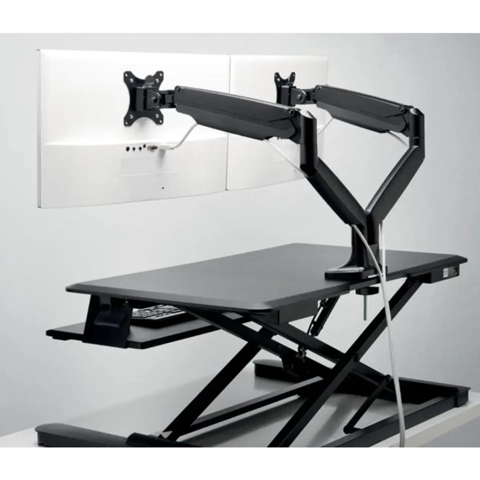 The product's cable management system organizes and hides cables while arms lift dual monitors and keep them out of the way, tidying up and freeing up valuable desk space.