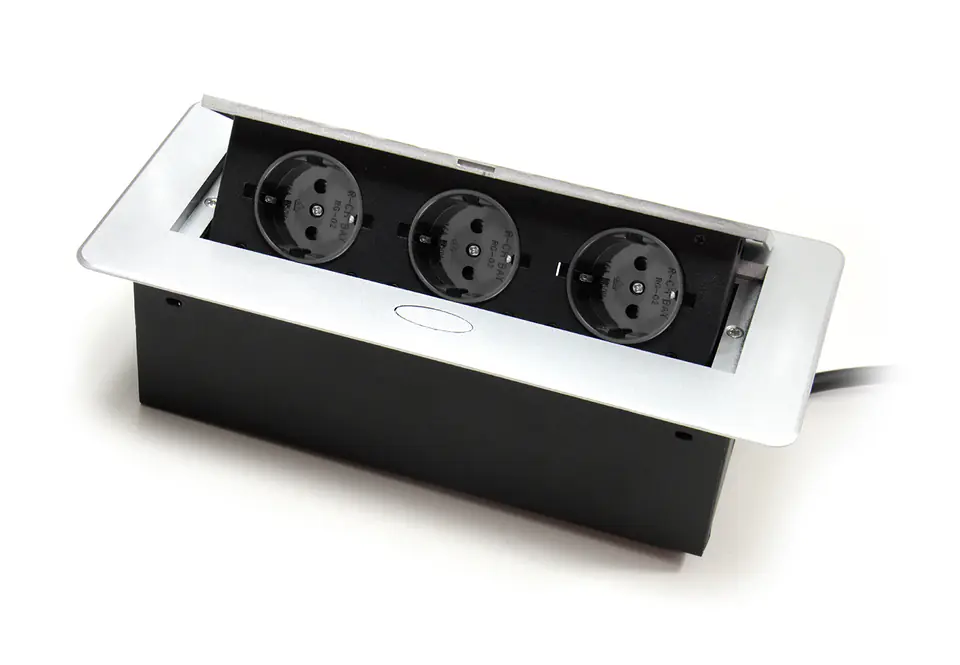 Mediaport Spacetronik ERGOLINE SPS-D33S V2 is a modern solution that is used in stores, showrooms, conference rooms, offices and at home. Press the button and the sockets will open smoothly. Made of aluminum and high quality components. The product is designed for indoor installation in desks, countertops and tables, both in a vertical and horizontal position, providing access to sockets. Mediaport has been equipped with 3 sockets 110-250 V (Schuko type).