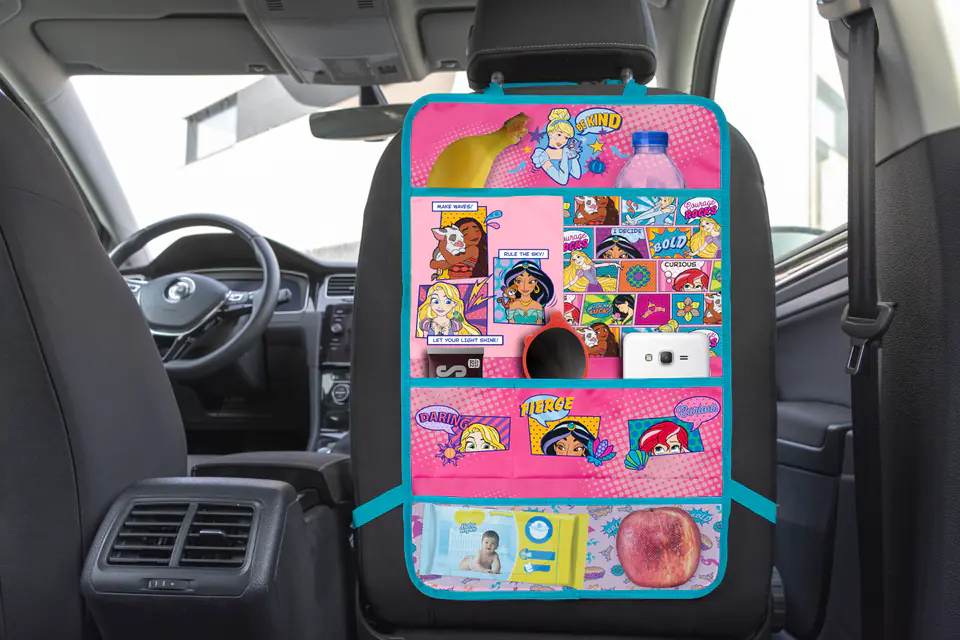 Universal organizer decorated with motifs from popular Disney fairy tales, fits most car seats. It is easy to install with the possibility of adjusting the length of the fastening straps.