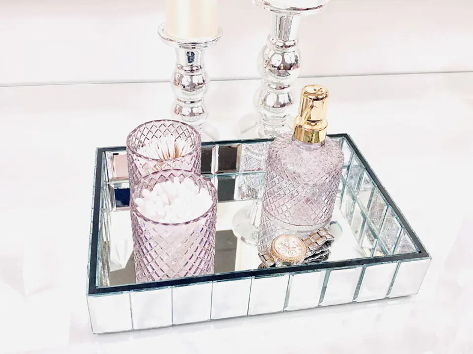 The Squre tray is made entirely of glass. A large mirrored glass pane forms the basis of the tray. The decorative border made of small mirrors protrudes 4.5 cm above the surface of the tray, protecting tall objects from falling and providing greater stability of the tray contents.