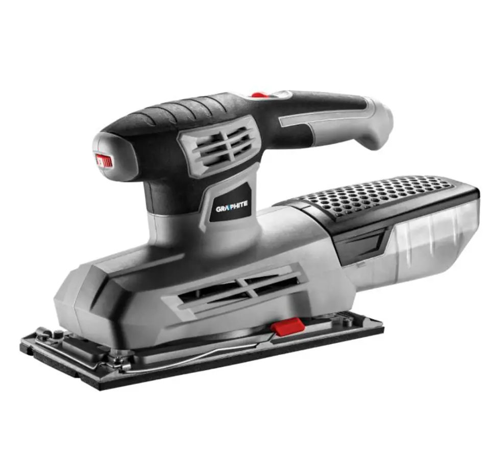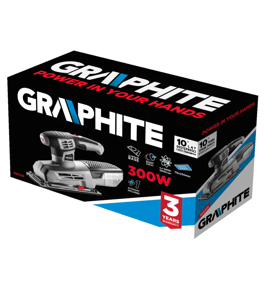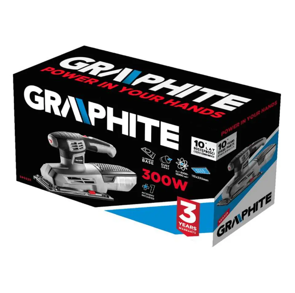 Specialized graphite oscillating grinder with a power of 300W, mainly designed for machining all kinds of wooden surfaces. Dimensions of the grinding foot: 115x230 mm. Thanks to its ergonomic shape and proper balance, the device provides high comfort during work. The housing and the main handle of the device have been covered with non-slip material. The switch of the grinder is equipped with a lock function for continuous operation. The grinder has the ability to smoothly adjust the revolutions. The speed of rotation of the grinder without load is from 6000 to 12000 min, the number of oscillations at idle from 12000 to 24000 min. The amplitude of oscillation is 2 mm. The grinder is equipped with a heat-resistant alloy made of aluminum alloy. The grinder also has an integrated dust extraction system and a quick sandpaper change system. The device is equipped with a flexible and durable power cord in a 3m long rubber coating, also dedicated to professional and industrial applications both indoors and outdoors. Included with the grinder is a dust container and additional sandpaper.