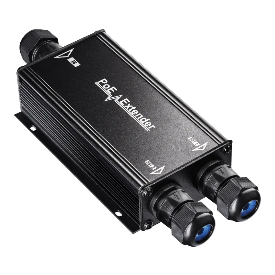The POE+ extender has Gigabit ports (10/100/100 Mbps) on the input and output. Thanks to this, you can get data transmission at the highest level. The device can also be mounted on the wall with screws. The Plug & Play function is very useful here - just connect the cables and tighten the sealing nuts.