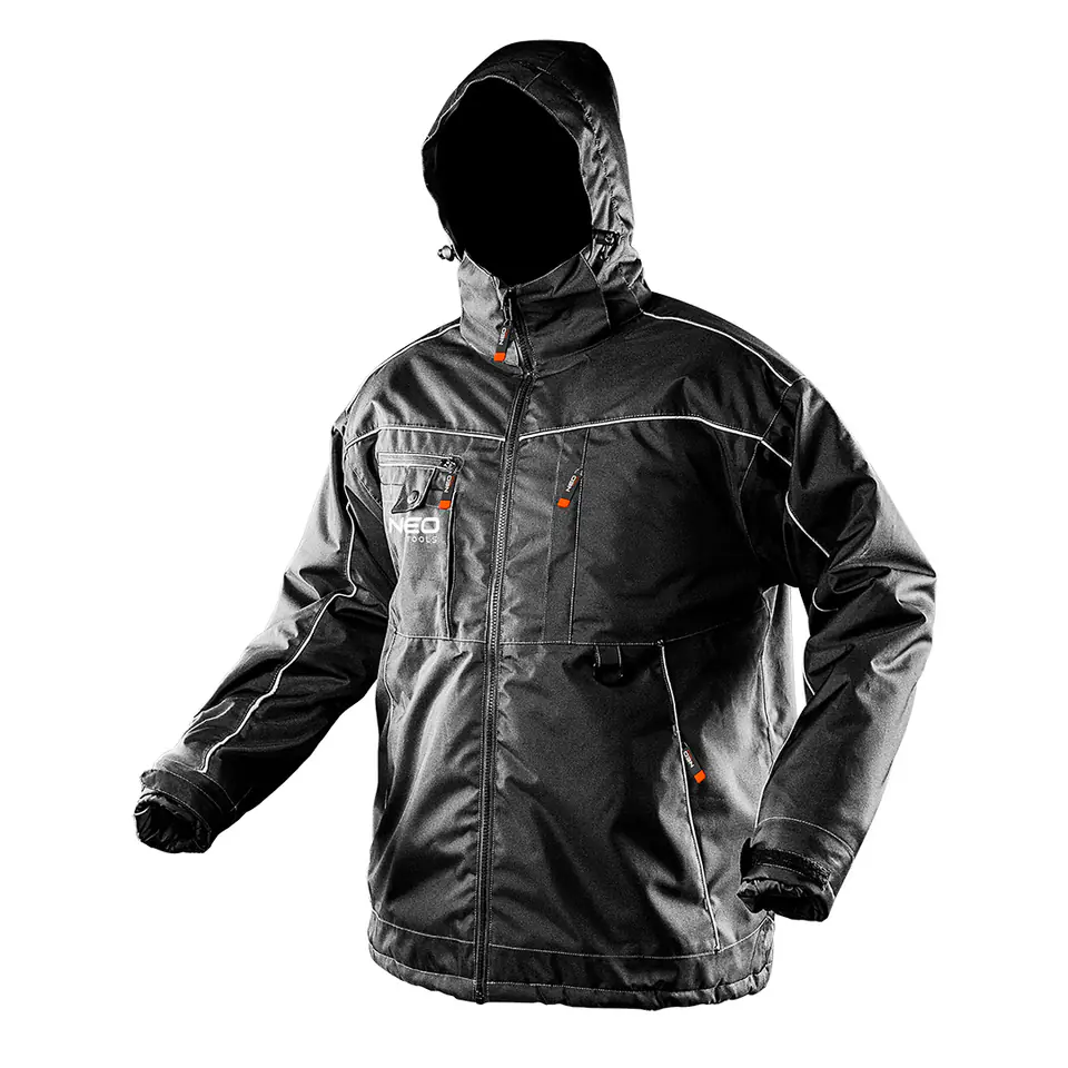 The NEO Winter Work Jacket (Ref. 81-570-XL) is windproof and waterproof. Very warm, but thanks to the materials used, it is light and durable. It does not restrict movement. Equipped with a detachable, adjustable hood and a high stand-up collar protecting the neck. The sleeves have adjustable welts, as well as additional internal cuffs, protecting against wind or rain inlet. In the lower seam of the jacket there are integrated adjustable welts that will allow you to keep warm with maximum comfort of use. The jacket has many useful pockets, including an enlarged smartphone pocket compared to previous designs. Thanks to the inner pocket and multifunctional hook, you can always have the things you need with you. Reflective elements provide greater visibility of the user. The quality guarantee is the European CE certificate and workmanship in accordance with EN ISO 13688:2013. The NEO brand meets the expectations of professionals. The NEO brand meets the expectations of professionals.