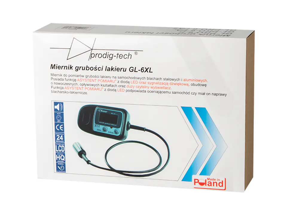 Gauges for measuring the thickness of paint on automotive steel and aluminum sheets. It has the MEASUREMENT ASSISTANT® function with LED and sound signaling, housing with modern, streamlined shapes and a large readable display.