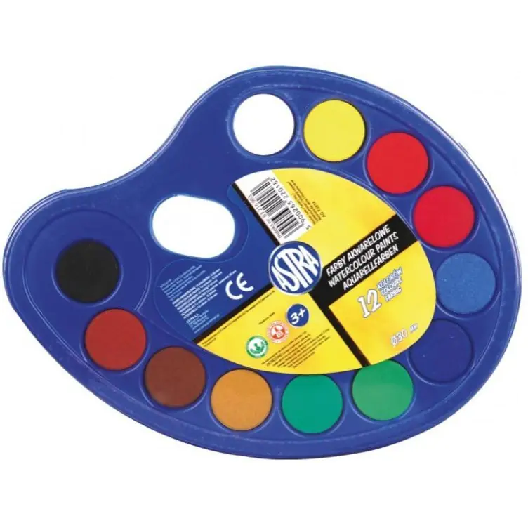 Watercolor paints are water-based paints used for painting on paper. They have the form of dry buttons, from which, when moistened with water, ready-to-use paints are obtained almost immediately. ASTRA school watercolors consist of high-quality finely rubbed pigments, connected by a water-soluble binder. In addition to pigments and binders, school watercolors contain some amounts of fillers that make the paint tarnish when it dries. Thanks to this, when applying paint thicker, you can paint with techniques similar to gouache, and in larger dilutions with techniques characteristic of watercolor. Watercolors can be used in combination techniques with tempera, poster and ASTRA wax pencils. ASTRA watercolors are intended mainly for children and school youth starting their art education. Thanks to their form, they can be easily moved, for example, in student schoolbags and stored for a long time without fear of changing properties