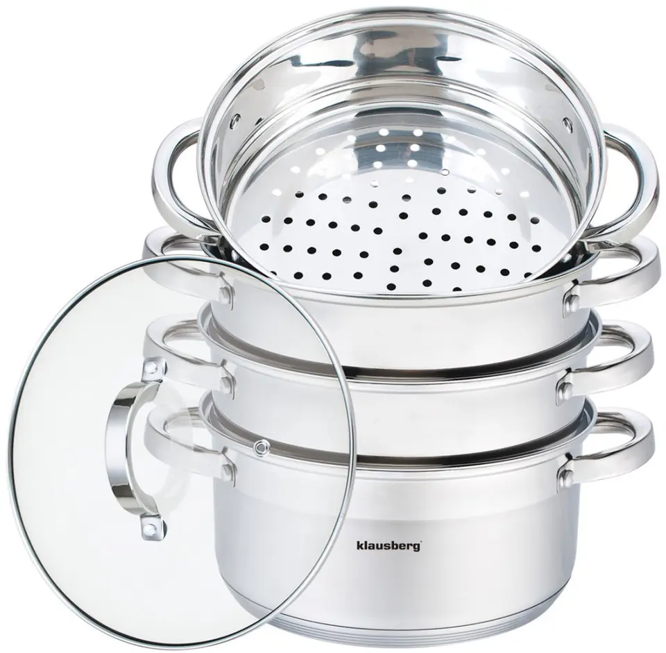The set of steaming pots is made of high quality stainless steel. The steel used consists of the best quality alloy commonly used in world-class products, which guarantees its high corrosion resistance and very good strength. The material used allows you to quickly heat the dishes and keeps the heat for a long time. The product is suitable for cooking on induction, gas, electric, ceramic and halogen cookers. It can be safely washed in dishwashers.