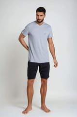 Who likes smooth pajamas in good colors hit perfectly. Duty - the latest pajamas by Henderson focuses on a comfortable cut and well-chosen colors. The T-shirt is distinguished by a subtle V-neckline, and on the chest you can see a small inscription. Includes smooth, black pants for the knee area. Ease and comfort for summer! Composition: top 88% cotton, 12% polyester, bottom 100% cotton.