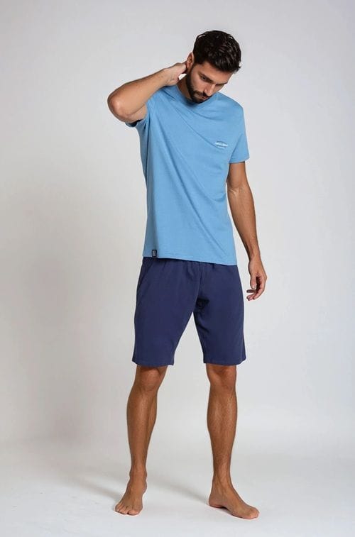 Kto lubi gładkie piżamy w dobrej kolorystyce trafił doskonale. Duty - najnowsza piżama marki Henderson stawia na wygodny krój i dobrze dobrane barwy. T-shirt wyróżnia się subtelnym V-dekoltem a na piersi możesz dostrzec mały napis. W zestawie gładkie spodnie do okolic kolan. Luz i komfort na lato! Skład: 100% bawełna.