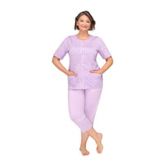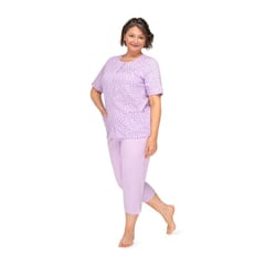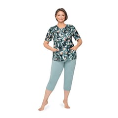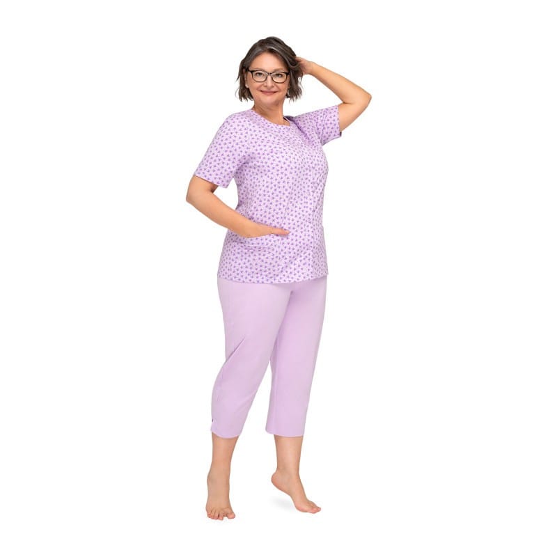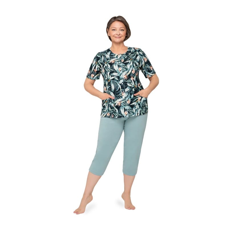 Pajamas with short sleeves, neckline finished with decorative trimming and reverse. The top of the pajamas is completely unzipped, printed with a motif in flowers or leaves, comfortable pockets on the sides. Pajama pants 3/4 length in solid color. Elastic waistband guarantees comfort and versatility of size. It fits perfectly into the figure. The product is made of high-quality, pleasantly nice and soft to the touch cotton, meeting Oeko - Tex standards. Pajamas ideal for summer evenings for women who value comfort and quality. Often chosen by ladies who are going to a sanatorium or planned hospital treatments.