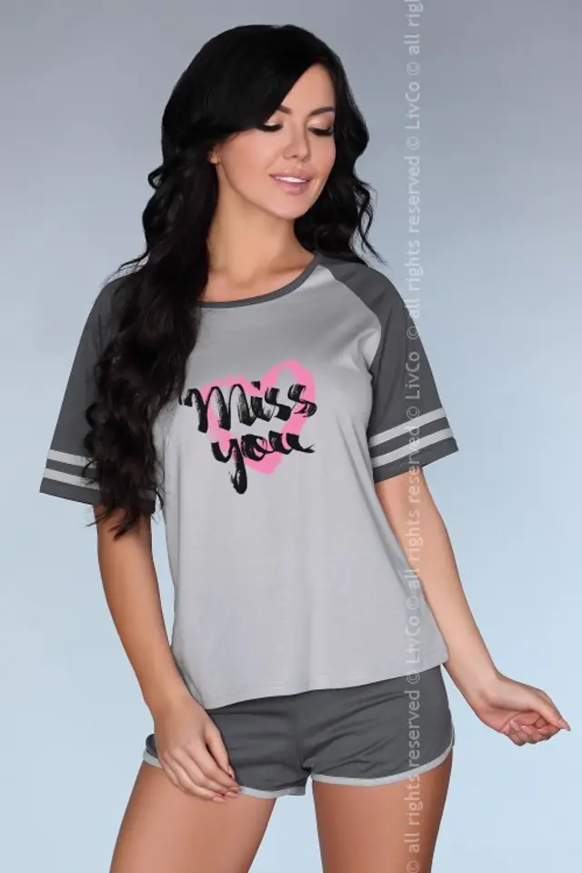 Comfortable, two-piece pajamas with the inscription "Miss You". In a shade of nice gray. Blouse with short sleeves and delicate neckline. In addition, characteristic, shorty shorts with semicircular finished legs. All cotton (100%).