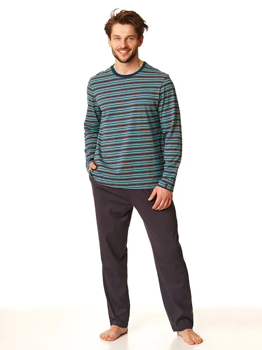 Uniwersalna piżama męska. Wykonana z niezwykle miękkiej, wysokiej jakości dzianiny bawełnianej. 100% włókno naturalne zapewnia ciepło i bardzo wysoki komfort użytkowania. Klasyczny krój góry i dołu. Bluza z okrągłym dekoltem.
