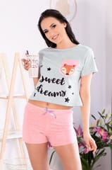 Sweet & sexy! This two-piece women's pajamas are all sweetness. The blouse is a short t-shirt in gray, with a fox print on the pocket. On the front there is also the inscription "Sweet dreams". Pink shorts with a delicate print and a bow at the waist are a classic, very good proposition. Composition: 100% cotton.