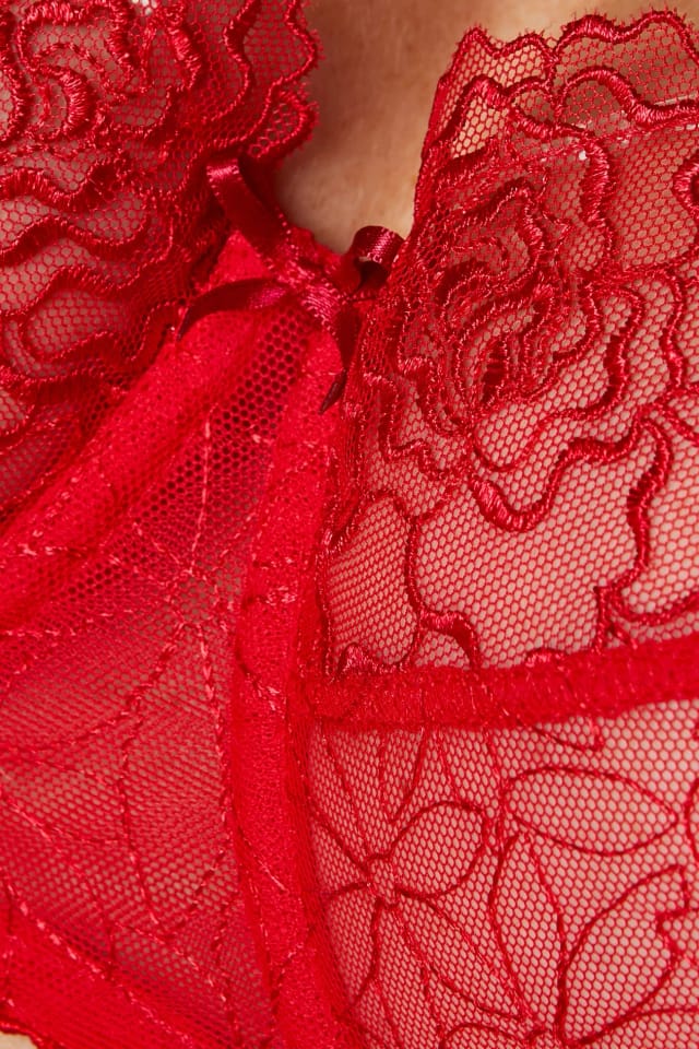 Biustonosz miękki wykonany z półprzeźroczystego haftu o subtelnym kwiatowym wzorze. Po bokach miseczki dodatkowo wzmocnione tiulem, który zapewnia lepsze zebranie biustu. Tył w całości wykonany z lekko połyskującej dzianiny gładkiej. Miseczki trzyczęściowe, o kroju balkonetki, delikatnie unoszą piersi nadając im piękny, naturalny kształt. Pionowe fiszbiny boczne zapobiegają marszczeniu się boczków. Wyjątkowego uroku bieliźnie dodaje szykowna kokardka z cyrkonią umieszczona między miseczkami.