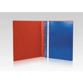Made of colored PVC film; spine and covers stiffened with cardboard; transparent pockets on the front cover and spine to mark the contents by a title page or label;