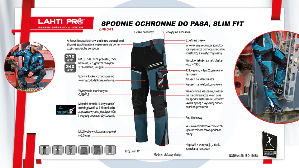 - Anti-slip band at the waist (on the inside) preventing the upper body garment from slipping out of the trousers