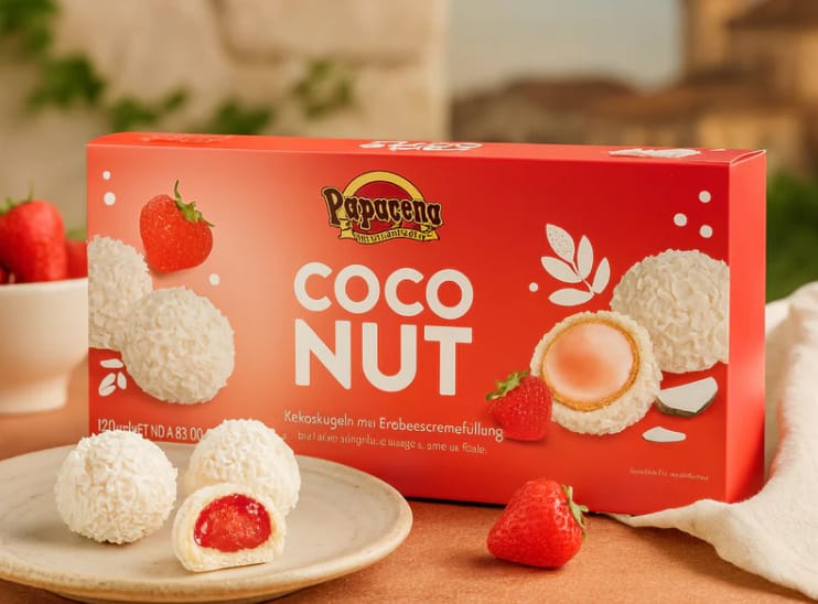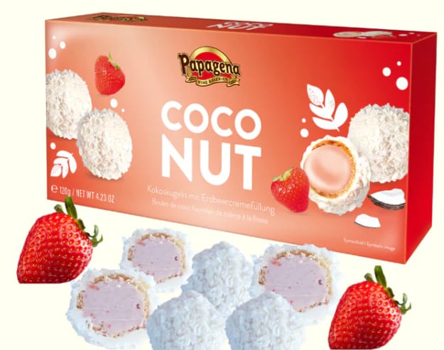 Ingredients:Filling 55% [sugar, vegetable fats (palm, shea butter), rapeseed oil, sweet whey powder (from MILK), MILK powder 7%, emulsifier: E322 (SOJA); Strawberry 1%, aroma, dye fruit and vegetable concentrates (black currant, black carrot)], coconut flakes 20%, WHEAT flour, vegetable fats (palm, shea butter), sugar, sweet whey powder (from MILK), emulsifier: E322 ( SOJA); raising agents: E500, E503; Yellow egg powder, salt, aroma.