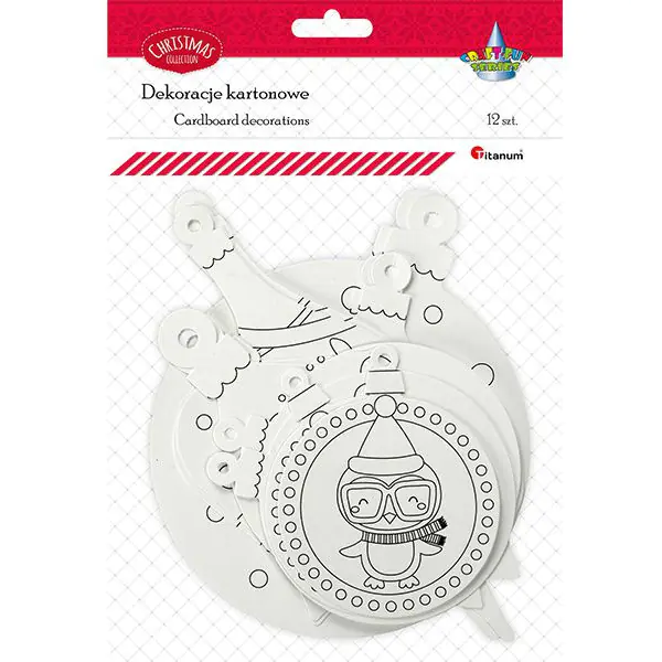 Cardboard pendants in the shape of baubles to finish with any technique. They can be painted with paints, crayons or felt-tip pens, as well as glued with decorative papers, in a set of 6 patterns, each of 2 pieces. Dimensions: from 80 to 165 mm, colour: white, blister: 12 pcs.